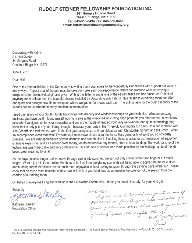 Below is a letter we recevied after completing the installation at 3 Fold Fellowship Community – to read about the project click here.